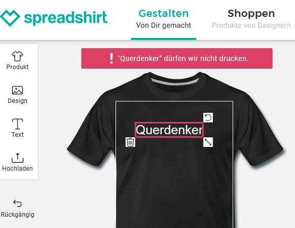 Querdenker. Wenn man bei der Firma spreadshirt, die das individuelle Bedrucken von Kleidungsstücken anbietet, das Wort „Querdenker“ auf ein T-Shirt drucken lassen will, geht das nicht und man erfährt: „Querdenker“ dürfen wir nicht drucken.