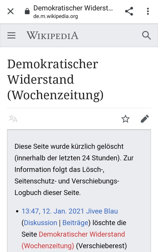 Demokratischer Widerstand. Der Wikipedia-Eintrag „Demokratischer Widerstand (Wochenzeitung)“ wird gelöscht. Die Zeitung ist ein in hoher Auflage produziertes Blatt, das sich gegen die Grundrechtseinschränkungen im Rahmen der Corona-Maßnahmen richtet.