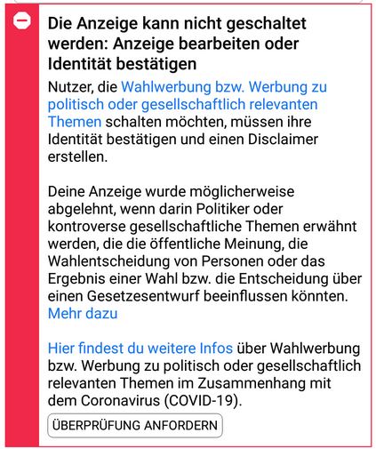 Freiblickinstitut. Der liberale Debatten-Verein (Betreiber dieser Website) möchte die Diskussionsveranstaltung COVID: Bringt die Impfung die Erlösung? auf Facebook bewerben. Facebook teilt mit, dass das nicht geht, da in der Anzeige möglicherweise „kontroverse gesellschaftliche Themen erwähnt werden.“ Vielen anderen geht es natürlich genauso.
